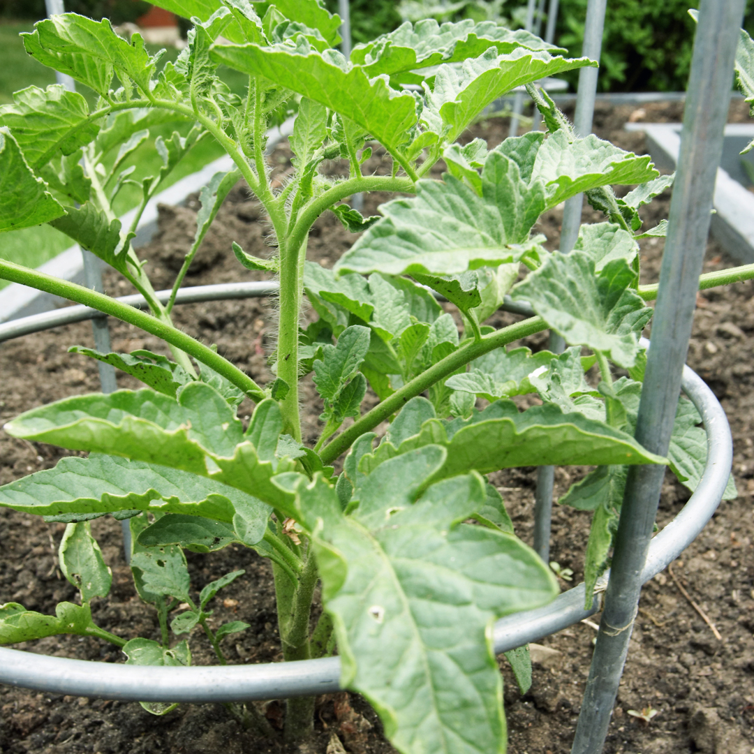 Materials Needed: Wooden or metal stakes, garden twine, or ties.For the single-stake method, drive a sturdy stake (6-8 feet tall) into the ground about 12 inches deep and 2-3 inches away from the tomato plant. As the plant grows, tie the main stem to the stake with garden twine, stretchy fabric, or soft ties every 10-12 inches. Remove suckers (the small shoots that grow in the crotch between the stem and a branch) to focus energy on the main stem. - Caging